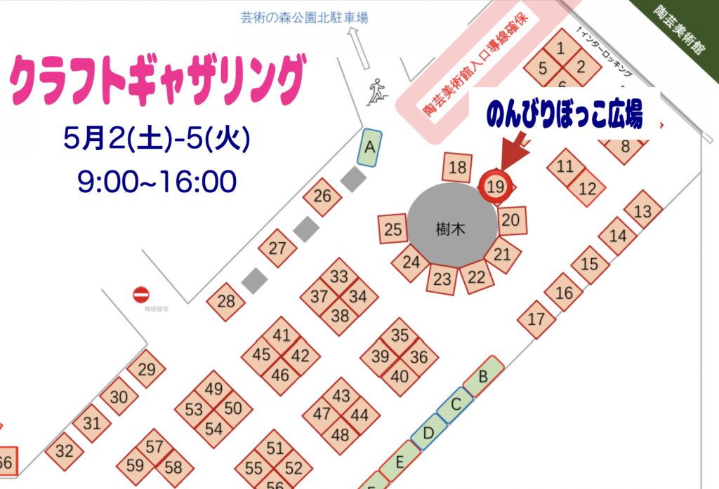 カラフルは、No.19(陶芸体験教室前)。クラフトギャザリングは、NO.19(陶芸美術館前)。