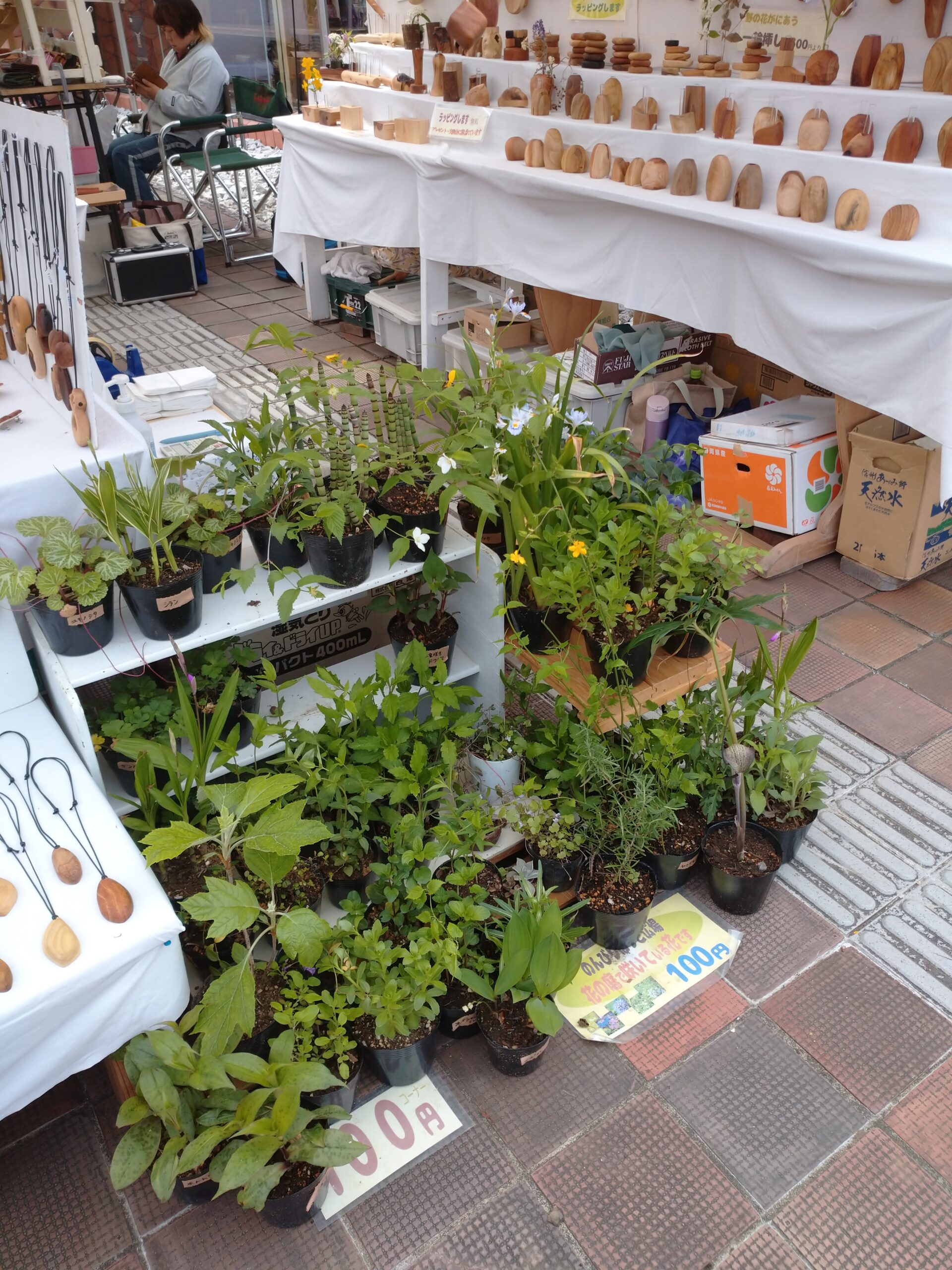 好評の、のんびりぼっこ広場育ちの花の苗(一鉢100円)や柳葉ミモザのドライフラワーも、お持ちします。